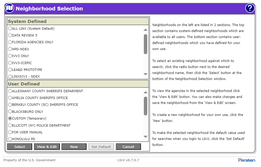 The LInX user has the capability to set any System Defined or User Defined neighborhood as their default neighborhood by selecting the radio button for that neighborhood, then clicking the Set Default button. The designated neighborhood will remain set as the default neighborhood for all subsequent searches for the current and future sessions, until the user selects another neighborhood to search or sets another neighborhood as the default.