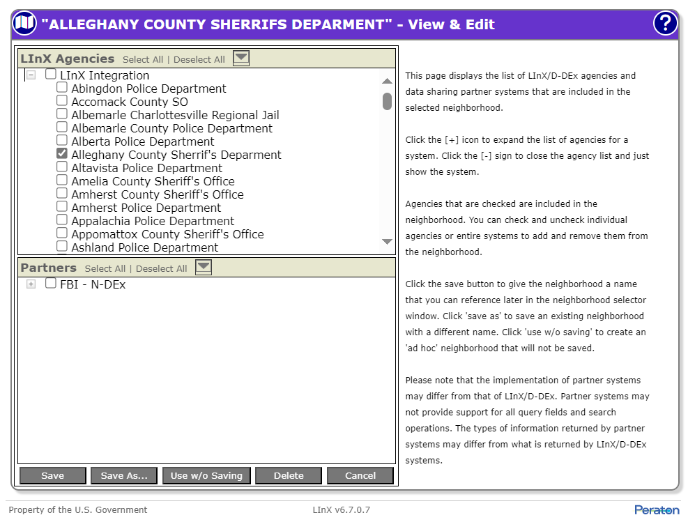 A LInX user has the capability to view the systems/agencies that comprise a particular neighborhood. A LInX user has the capability to edit the systems/agencies that comprise their own user-defined neighborhoods.