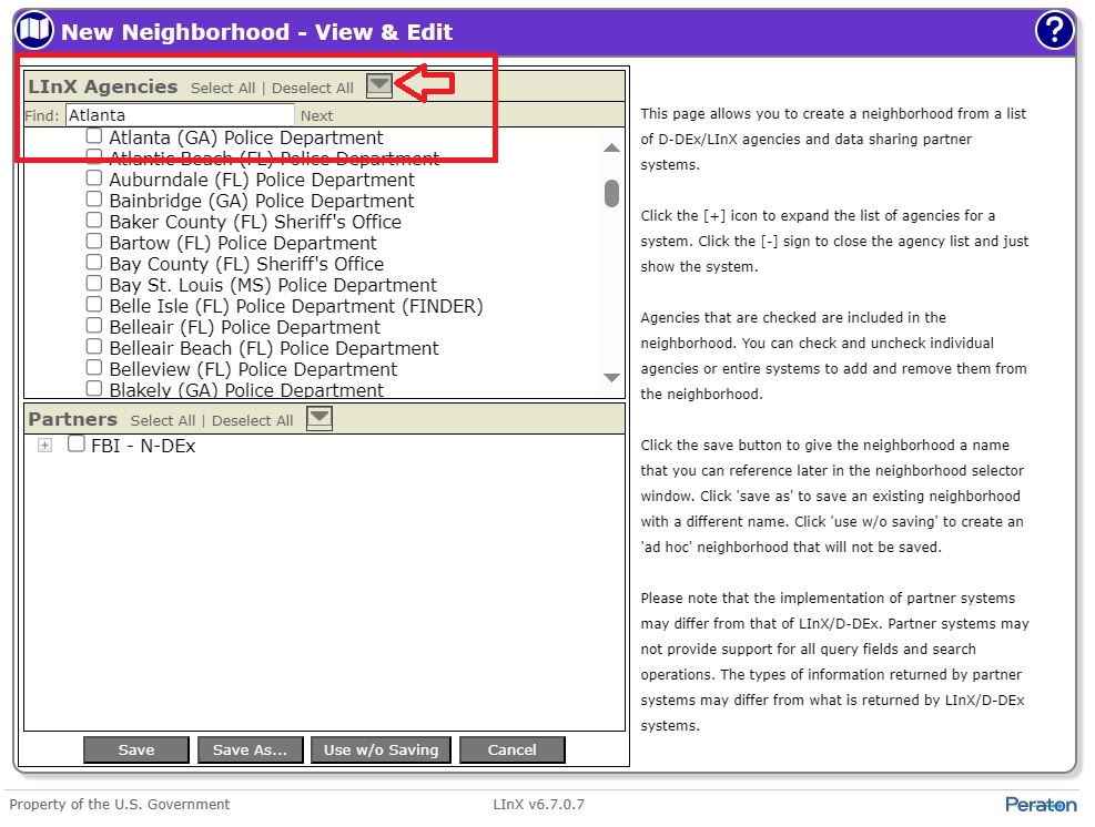 A LInX user has the capability to customize their own existing neighborhood(s) by adding or removing available agencies and/or partner systems, then saving the edited neighborhood under the same or a different name.