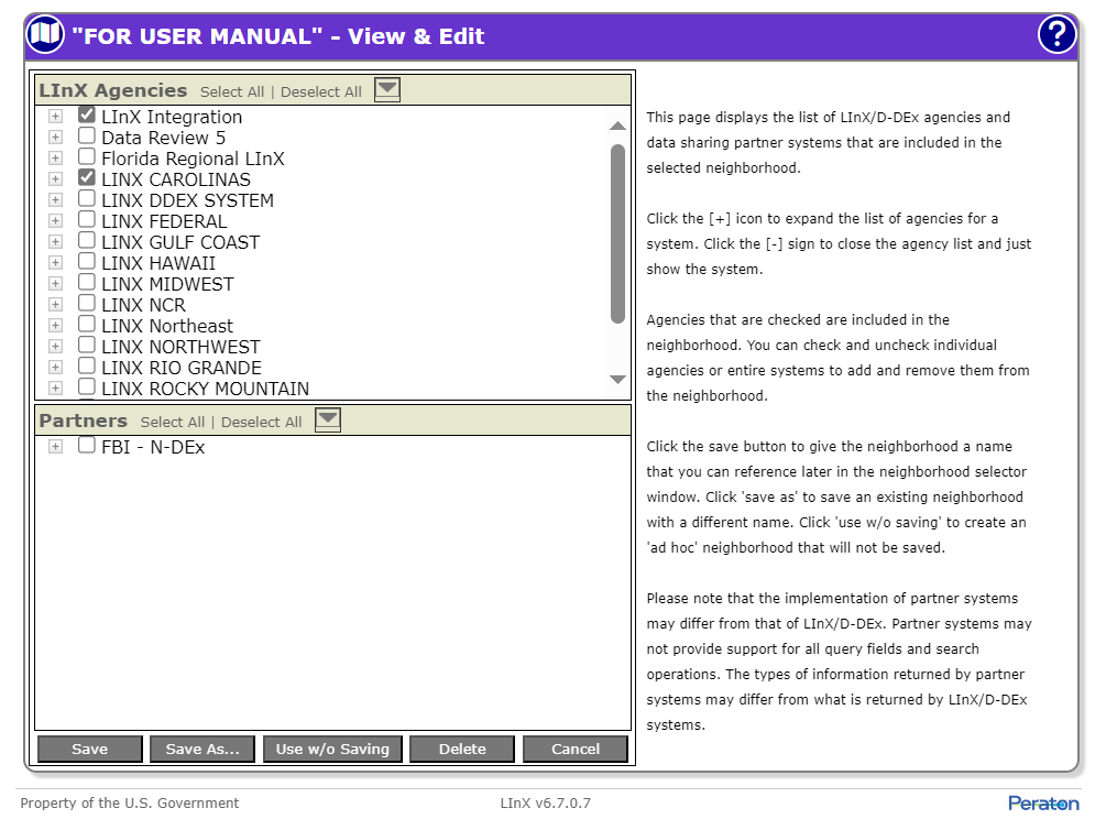 The Neighborhood View and Edit screens provide instructions on using the neighborhood editor. In addition, the screens contain a note about differences between LInX/D-DEx and partner systems search capabilities and the data returned from them.