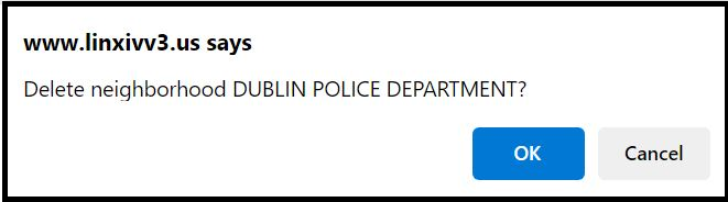 This capability allows a LInX user to delete any of their own user-defined neighborhoods. To delete a neighborhood, click the radio button for the desired neighborhood, then click the View & Edit button at the bottom of the Neighborhood Selection screen to display the View & Edit screen for the selected neighborhood. When the Delete button at the bottom of the View & Edit screen is selected, a pop-up confirmation window is presented. Clicking the Cancel button will close the confirmation window without deleting the neighborhood. Clicking the OK button will delete the selected neighborhood and return the user to the Neighborhood Selection screen.