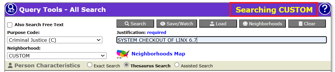 Click the radio button next to Custom (Temporary Neighborhood) if it is not already chosen, then click the Select button at the bottom of the Neighborhood Selection screen. The selected neighborhood will be activated, and the user will be returned to the screen from which the Neighborhood Selection was chosen. The Searching Status on any query screen will reflect that the Custom neighborhood will be searched.