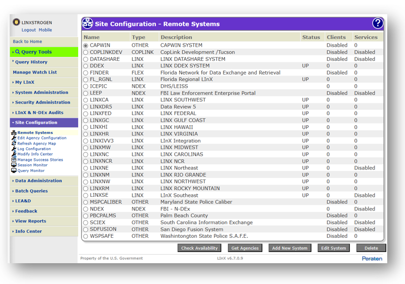 In order to commence sending LInX agency records to a remote, third-party system, the Super User must first set-up a remote system profile. The Remote Systems Administration screen allows Super Users to add, edit, and delete profiles.