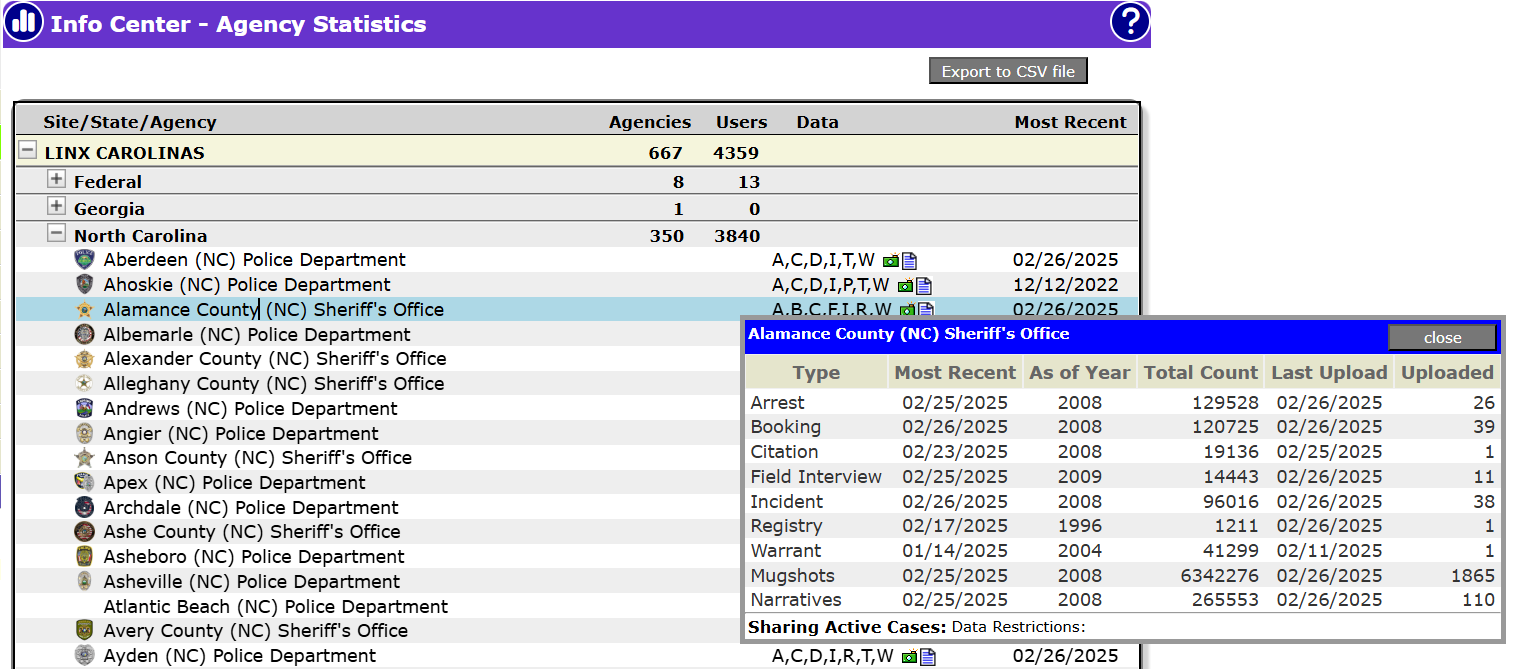 Agencies or organizations listed under states will provide types of data, as well as the most recent data sent to LInX. Clicking on individual lines provides a breakdown of data types and dates.