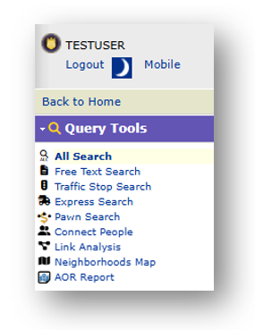 The Mobile version site offers a more streamlined query/result capability for use with mobile terminals, and is available from all screens, except Link Analysis, Feedback, System/Security Administrator screens, or when a user is viewing the application in Night Mode.