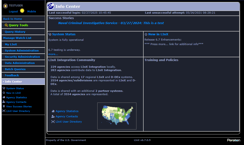 The Training and Policies section contains a number of links that provide additional resources for the user, including the LInX User Guide, Quick Tips, and training. Selecting the Back to Home menu option from top of the left navigation menu will return the user to the main Info Center screen from any of these sub-screens.